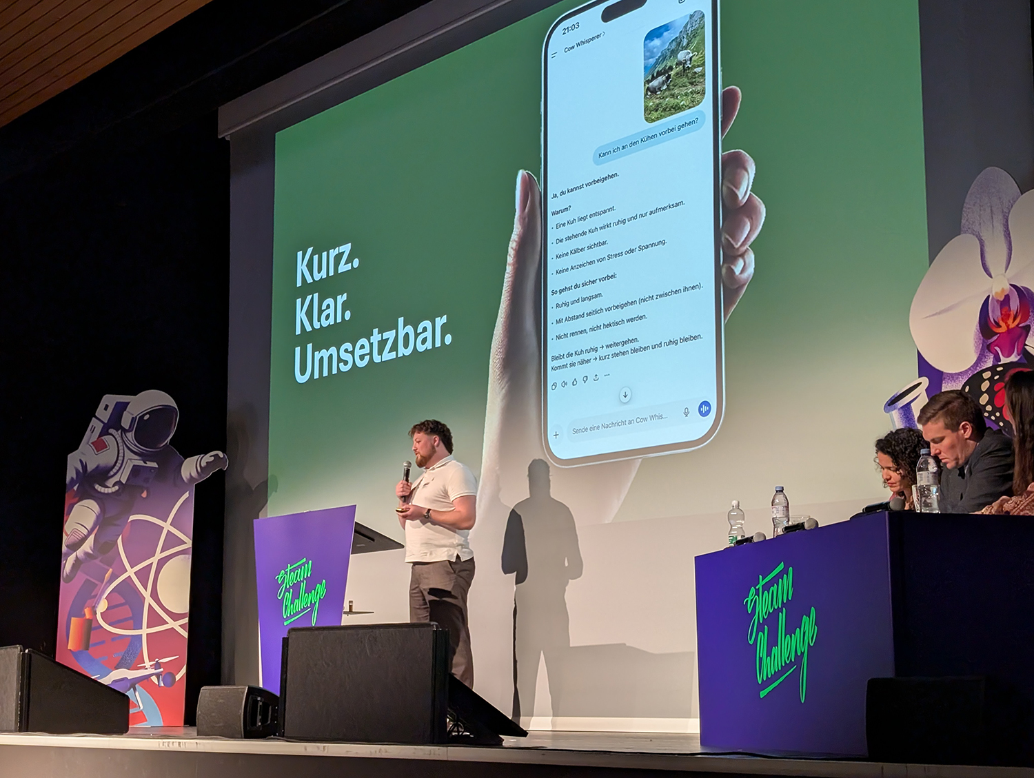 Bei der STEAM Challenge 2026 unter dem Motto „Innovation under Pressure“ traten am 3. März 2026 im Spirgarten Zürich sechs Projekte gegeneinander an. Dabei waren u.a. Autobike von Daniel Lagnaux und Mark Bezmalinovic von der ETH Zürich und Repair Scanner von Aron Bienge, einem Zimmermeister. Moderiert wurde der Abend von Sara Taubman-Hildebrand, während die Comedians Gülsha Adilji, Reena Krishnaraja und Zukkihund mit humorvollen Einlagen für zusätzliche Unterhaltung sorgten und die Projekte auf ihre Weise interpretierten. Eine Menge von über 200 Personen füllte den Saal und zeigte sich zwei Stunden lang in bester Stimmung. Eines der vorgestellten Projekte war der Animal Whisperer, initiiert von Prof. Dr. Oliver Bendel von der Hochschule für Wirtschaft FHNW. Sein damaliger Student Nick Zbinden hat in seinem Auftrag den Cow Whisperer, den Horse Whisperer und den Dog Whisperer implementiert. Dabei wurden einem Multimodal Large Language Model (MLLM) mithilfe von Retrieval-Augmented Generation (RAG) die gewünschten Fähigkeiten verliehen. Es werden zuerst die Körpersprache der Kühe, Pferde oder Hunde sowie die jeweilige Gesamtsituation analysiert und evaluiert. Dann werden Empfehlungen für das Verhalten der Menschen gegeben, die den Tieren begegnen. Bei der Animal-Computer Interaction 2024 in Glasgow wurde Oliver Bendel und Nick Zbinden bereits ein Award für ihr Paper „The Animal Whisperer Project: A GenAI App for Decoding Animal Body Language and Behavior“ verliehen. In ihrer Interpretation entdeckte Gülsha Adilji auch Potenzial für das Dating – denn auch die Körpersprache von Männern könnte interpretiert werden. Das Jurymitglied Nathalie Klauser lobte das Animal Whisperer Project für die Einbeziehung von Tieren. Sieger wurde am Ende BlueGreens von Sebastian Haymann. Den Publikumspreis gewannen die Zürcher Schülerinnen Nina Zvezdina und Poppy Alexander.