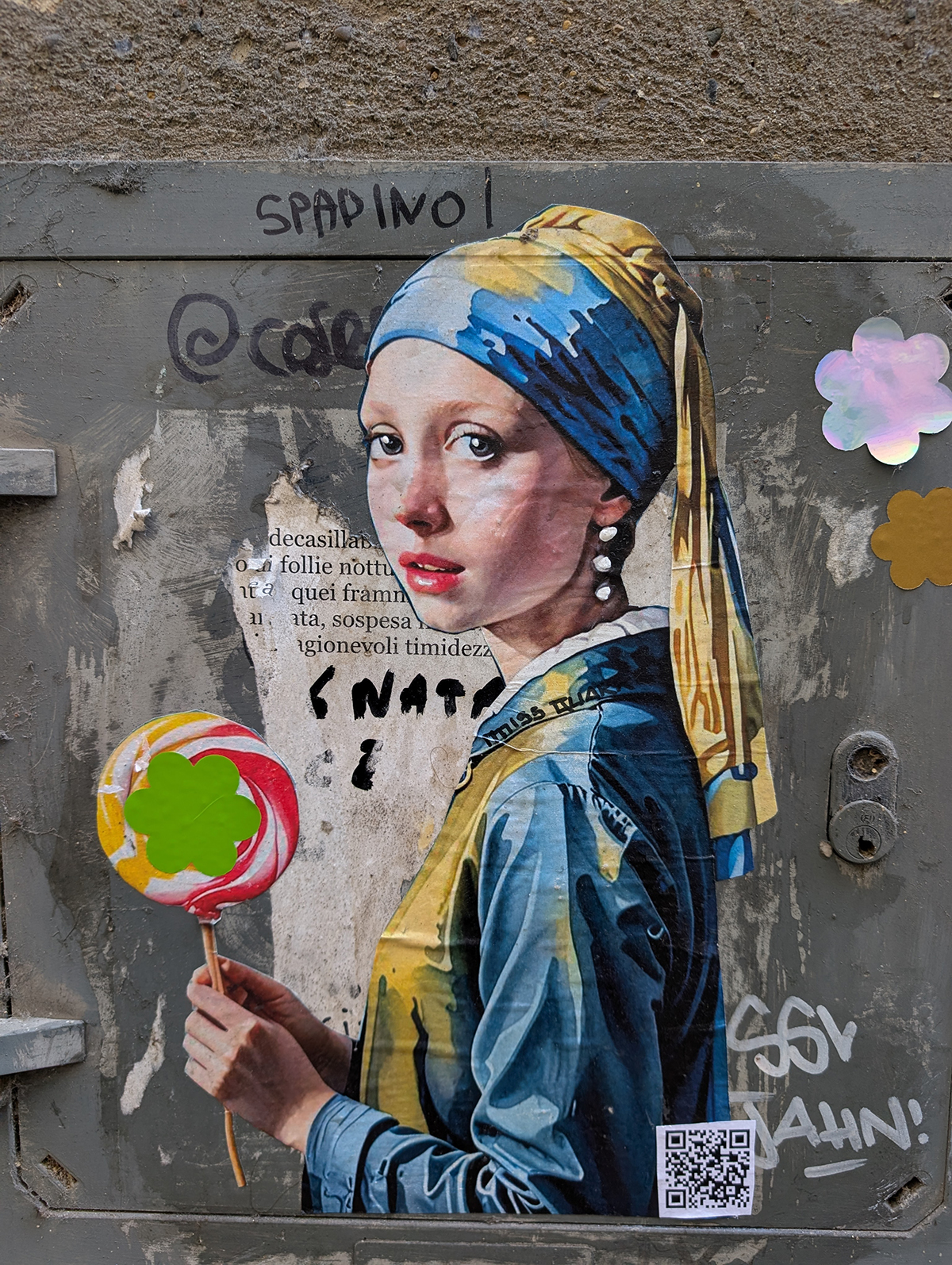 Andrew Graham-Dixon legt mit „Vermeer: A Life Lost and Found“ (2025) eine neue Deutung von Jan Vermeers berühmtem Gemälde „Girl with a Pearl Earring“ („Das Mädchen mit dem Perlenohrring“) vor. Dieses sei weder ein rätselhaftes Idealbild noch eine namenlose Studie, sondern ein religiöses Erinnerungsbild. Das Gemälde sei für das Haus von Maria de Knuijt und Pieter van Ruijven entstanden, mit deren Tochter Magdalena als Modell. Wenn es entgegen verbreiteter Annahmen nicht auf 1665, sondern auf 1667 datiert werden kann, war sie in jenem Jahr 12 Jahre alt geworden und hatte als Collegiatin ihr Bekenntnis zu Jesus Christus abgelegt. Die Werke der Streetart-Künstlerin Miss Quark sind in Florenz zu bewundern. Sie interpretiert u.a. berühmte Figuren wie das Mädchen mit dem Perlenohrring oder Mona Lisa und berühmte Frauen wie Frida Kahlo oder Marilyn Monroe neu. Magdalena – oder um wen es sich auch immer handelt – ist mit einem riesigen Lolli zu sehen. Dieser wurde inzwischen wiederum mit einer Art Prilblume überklebt, wodurch er etwas an Wirkung verliert – aber damit muss die Kunst auf der Straße immer rechnen. Oliver Bendel hat in seinem Haikuband „Sanftes Erröten“ mehrere Gemälde von Vermeer bedichtet, etwa „Das schlafende Mädchen“ (1657) und „Briefleserin am offenen Fenster“ (ebenfalls 1657), nicht aber „Meisje met de parel“, wie das Werk im Original heißt.