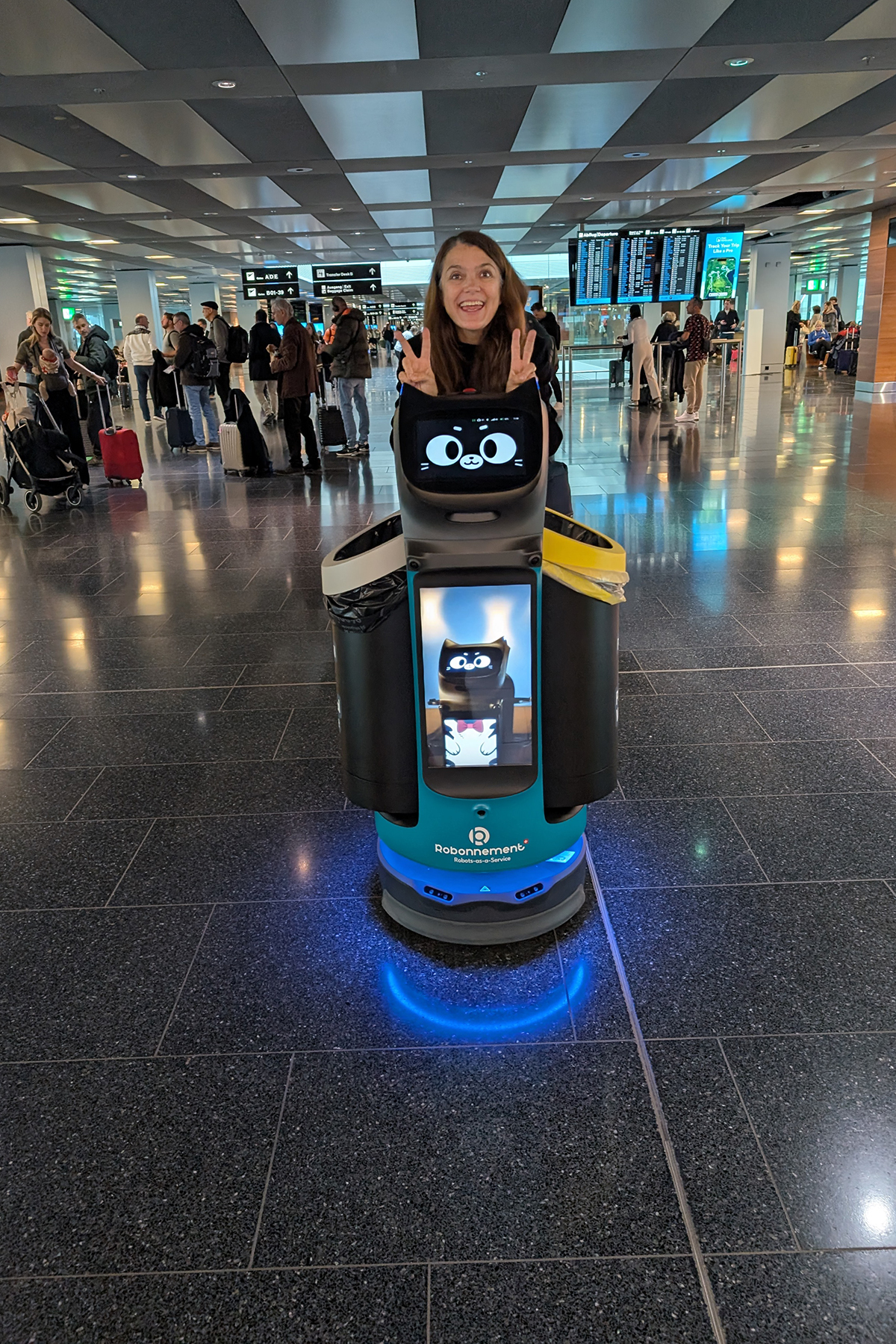 Am Flughafen Zürich werden immer wieder Serviceroboter ausprobiert und eingeführt. Laut einer Meldung vom 14. Dezember 2023 wurde das rund 300-köpfige Gebäudereinigungsteam um zwei Serviceroboter namens Zulu und Charlie ergänzt. Diese stammen von der Firma LionsBot aus Singapur (www.lionsbot.com) und gehören zu den LEOBOTS. Im Herbst 2025 sieht man viele Reinigungsroboter von TASKI (Ecobot 50 und 6 vom Typ Phantas) ihre Runden drehen. Sie sind oft in erstaunlicher Geschwindigkeit bei den Check-in-Bereichen, Terminals und Aufenthaltszonen unterwegs. Der Flughafen Zürich erläutert: „Die Geräte navigieren bis zu 24 Stunden selbstständig durch den laufenden Betrieb, erkennen Hindernisse, entleeren Schmutzwasser und laden sich eigenständig wieder auf.“ (Website Flughafen Zürich) Inzwischen taucht auch BellaBot auf, den Zürcher bereits von Hiltl Sihlpost kennen. Der Transportroboter wurde zum Abfallsammelroboter umfunktioniert. Er rollt direkt zu den Besuchern und Passagieren, die etwas für ihn haben könnten, etwa eine Plastikflasche oder Restmüll. Das Angebot wird nicht nur rege angenommen – viele sind auch begeistert von dem freundlichen Katzengesicht und den Plastikohren und berühren BellaBot oder machen Selfies.