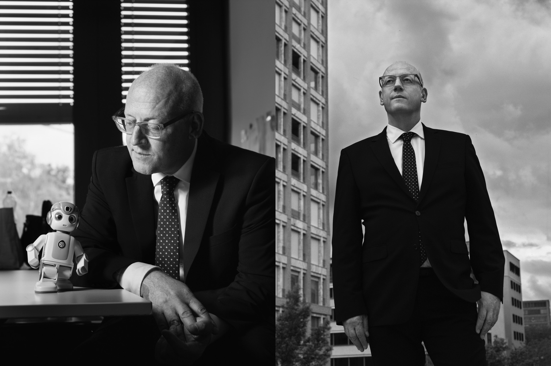 Abb.: Oliver Bendel mit QTrobot (Foto: Sarah Bestgen)