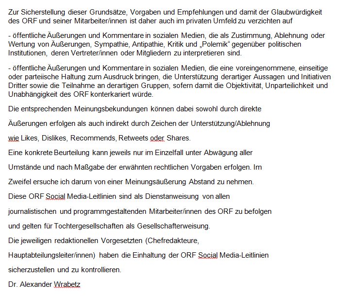 ORF-Generaldirektor Alexander Wrabetz hat einen Entwurf für Social-Media-Richtlinien vorgelegt. Ist das Dokument, das derzeit in den sozialen Medien kursiert, echt, ist man beim Sender nicht in der Lage, den Begriff richtig zu schreiben. Mehrmals ist von „ORF Social Media-Richtlinien“ die Rede. In den Medien wird die falsche Schreibweise teils stillschweigend korrigiert, was eine Verfälschung des Originals darstellt, teils kommentarlos übernommen. Aber weg vom Formalen, hin zum Inhaltlichen. Der Spiegel fasst zusammen, dass bei Inkrafttreten der Dienstanweisung die Mitarbeiter des ORF sich „nicht mehr politisch kommentierend äußern“ dürfen – „auch nicht als Privatpersonen“ (SPON, 27. Juni 2018). Sogar „Likes, Dislikes, Recommends, Retweets oder Shares“ seien zu unterlassen, denn eine „Meinungsbekundung“ (SPON, 27. Juni 2018) könne auch indirekt erfolgen. Die Zeitschrift spricht in der Überschrift ihres Artikels von einem „Maulkorb“. In ihrer Analyse stellt sie fest, dass sich mit der geplanten Verordnung „Vertreter der Regierungsparteien ÖVP und FPÖ im Stiftungsrat … durchgesetzt haben“ (SPON, 27. Juni 2018). SRF hatte ebenfalls rigide Richtlinien, die vor der No-Billag-Initiative etwas gelockert wurden, damit sich die Journalisten gegen diese aussprechen konnten. Grundsätzlich handelt es sich bei Social-Media-Richtlinien dieser Art um einen massiven Eingriff in die Meinungsfreiheit, der von Medien- und Informationsethik untersucht werden kann.